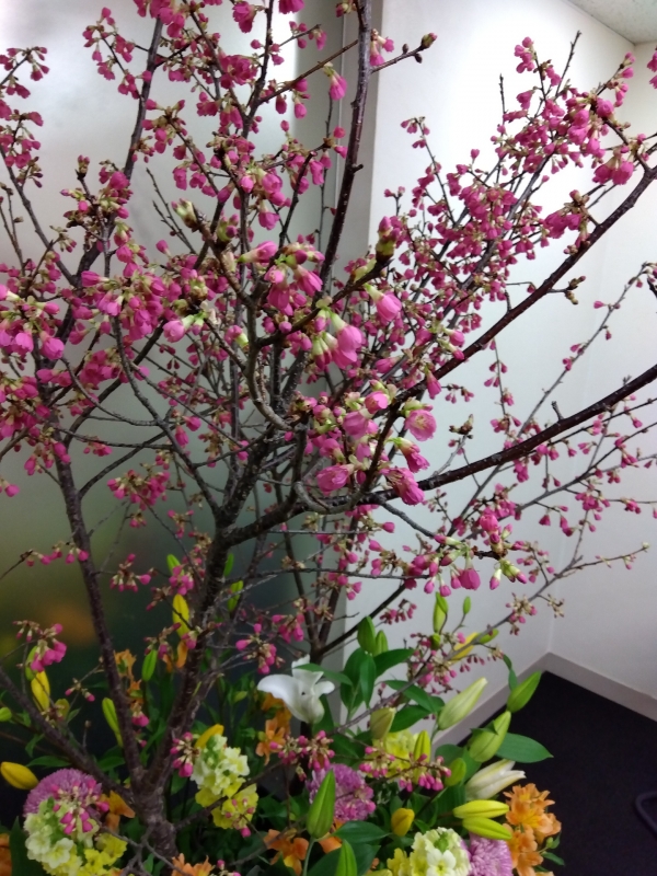 弊社エントランスの寒緋桜(カンヒザクラ)が鮮やかな花を咲かせ、